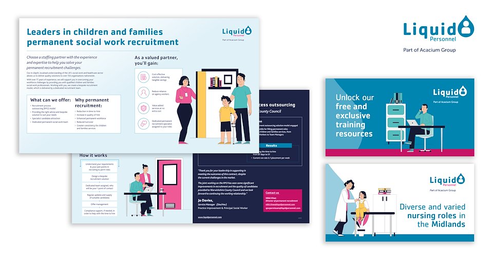 At Liquid Personnel, a leading recruitment specialist for social work and healthcare professionals (part of Acacium Group), I contributed to a range of marketing collateral that supported both candidate engagement and corporate visibility. The agency partners with local authorities, the NHS, fostering agencies and charities to deliver both permanent and agency staffing solutions.