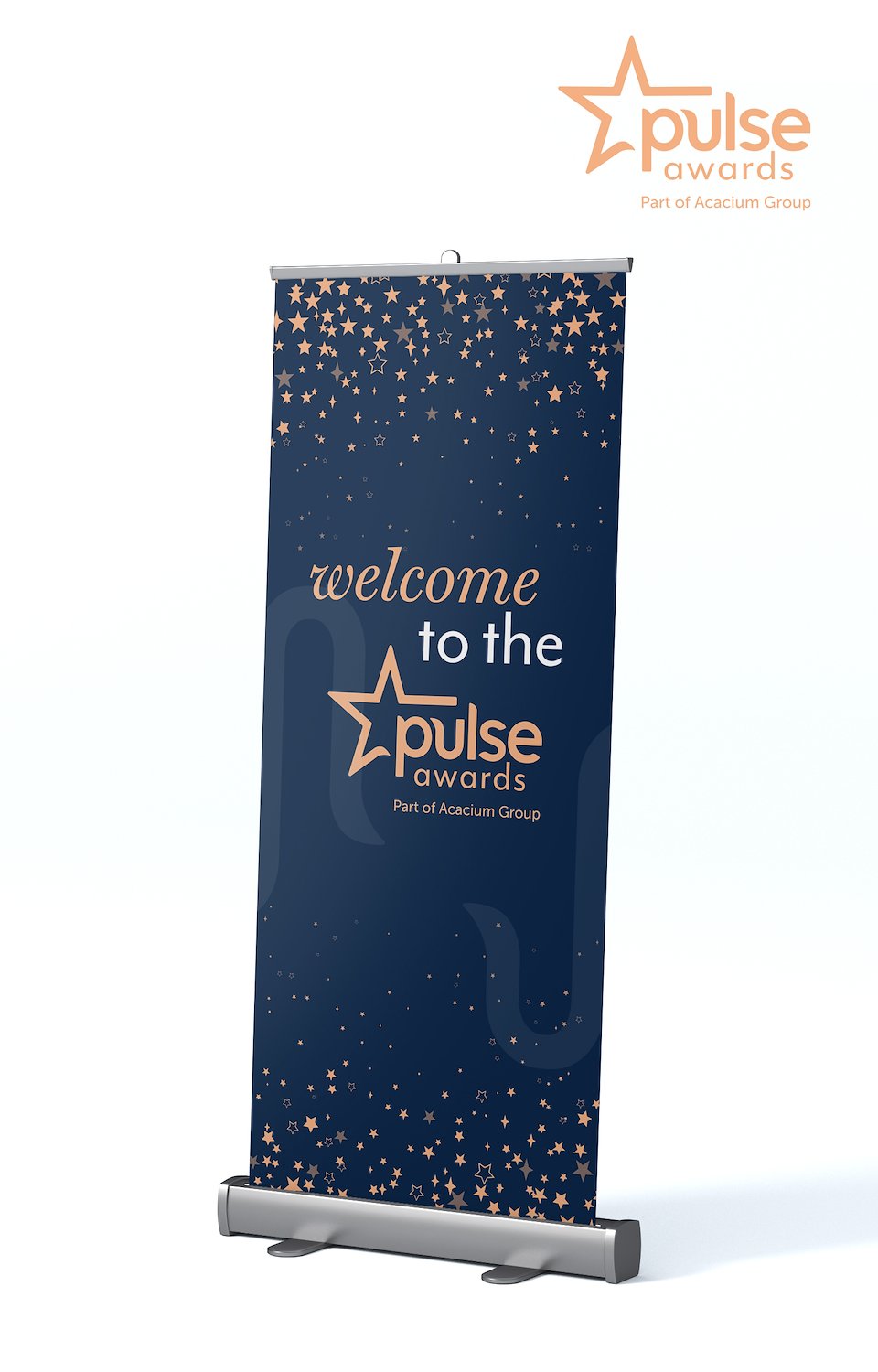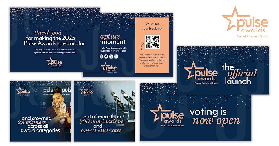I also created the visual identity for the Pulse Awards, adapting the main brand logo to a softer, all-lowercase format with rounded edges. This bespoke version was used across various touchpoints, including social media assets, welcome postcards and large-format event materials.
